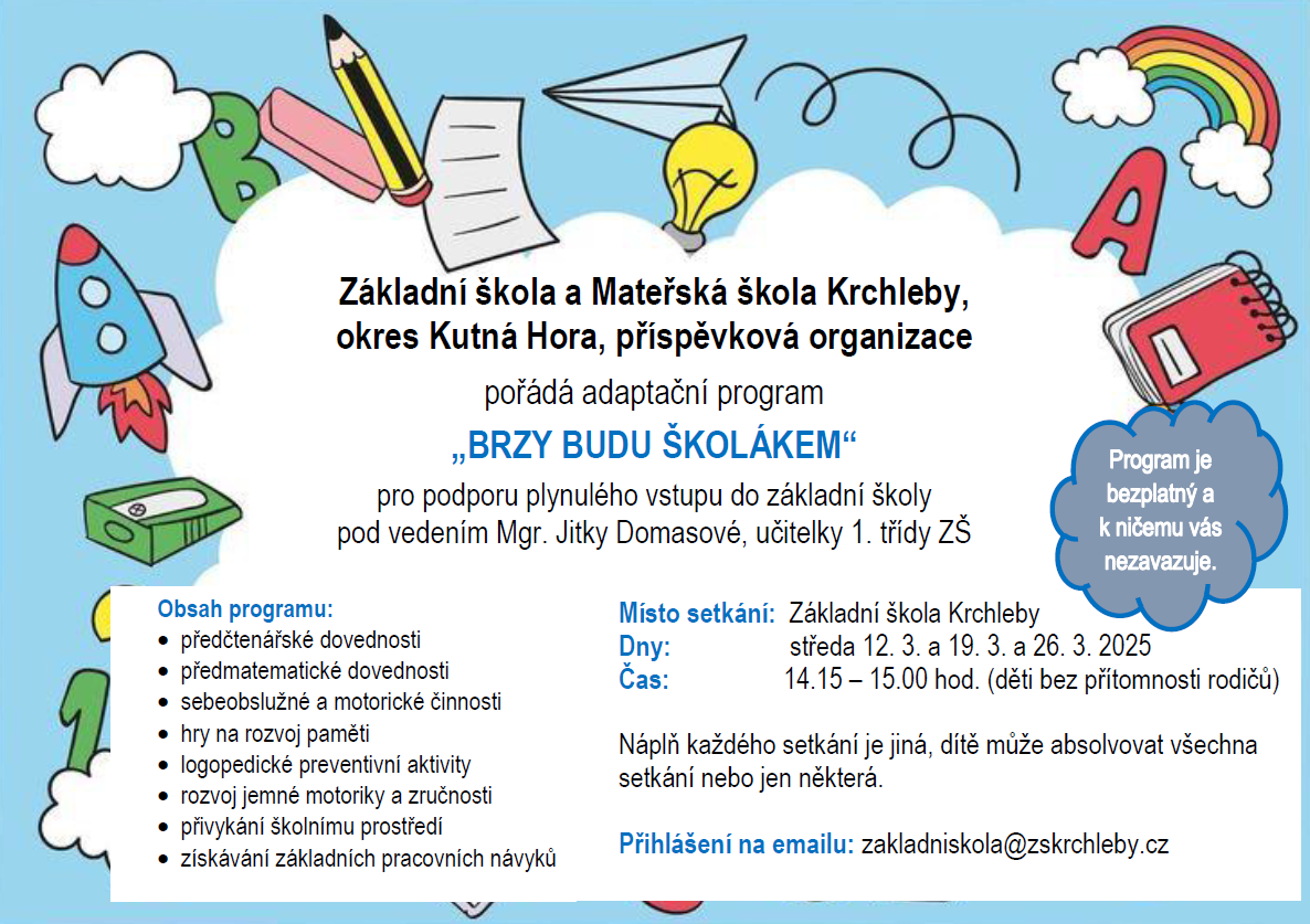 Pro podporu plynulého přechodu z mateřské do základní školy nabízíme dětem adaptační program "Brzy budu školákem". Plánujeme 3 setkání v březnu, ale můžete přijít jen 1x. Program je bezplatný a nezávazný. Prosíme o rezervaci na reditelka@zskrchleby.cz.