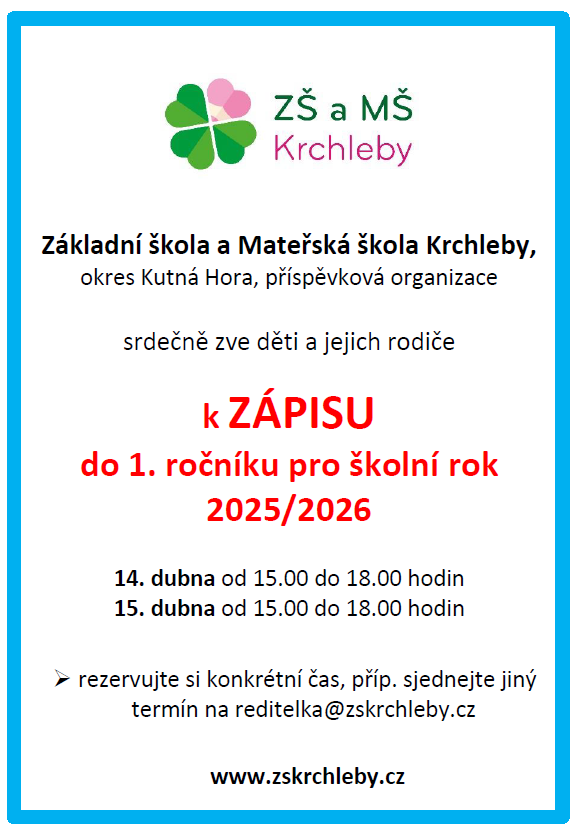 Srdečně zveme děti a jejich rodiče k zápisu do 1. ročníku pro školní rok 2025/2026, a to ve dnech 14. a 15. dubna od 15 do 18 hodin. Kritéria jsou zveřejněna v sekci "úřední deska", žádost o přijetí zde a na úřední desce. Prosíme rezervujte si termín, příp. domluvte jiný na reditelka@zskrchleby.